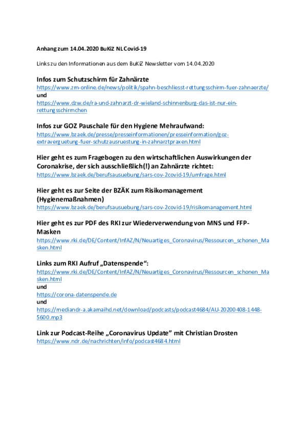 4. Die Bundeszahnärztekammer hat auf ihren Seiten das um „Behandlung von Patienten, für die kein dringender Verdacht besteht, mit SARS-CoV-2 infiziert zu sein“ aktualisierte Risikomanagement (Hygieneplan, Hygieneleitfaden) veröffentlicht.