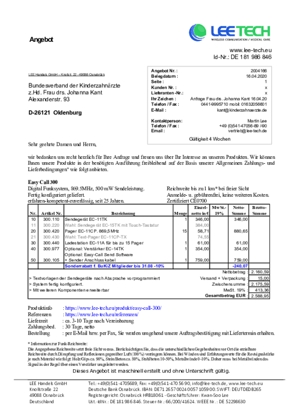 4. Für Praxen, deren Räumlichkeiten (wie bei Annemarie leider auch) recht beengt sind und im Wartezimmer bzw. in der Anmeldung der Platz nicht ausreicht, einen Sicherheitsabstand zwischen allen Patienten zu gewähren haben wir einen Tipp: hier kann ein Pager System eine Lösung sein. Wir haben die Kosten dafür recherchiert und ein Angebot für die Mitglieder unseres Verbandes bekommen. Dieses findet ihr im Anhang.